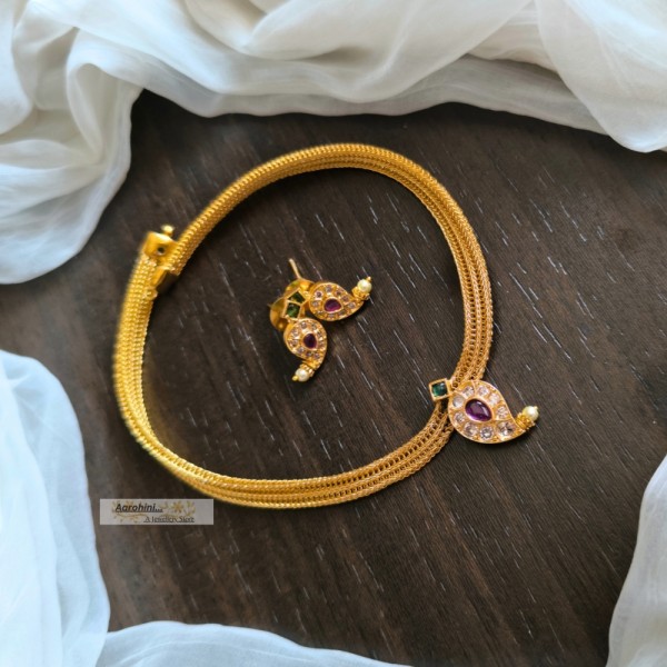 Antique polish premium quality brass metal traditional simple ruby, green, and white stone mango design antique gold look-alike chocker and matching earrings stud.