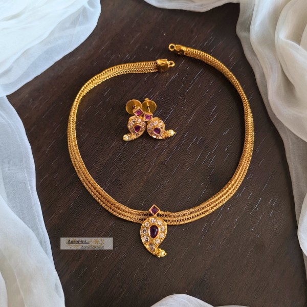 Antique polish premium quality brass metal traditional simple ruby, green, and white stone mango design antique gold look-alike chocker and matching earrings stud.