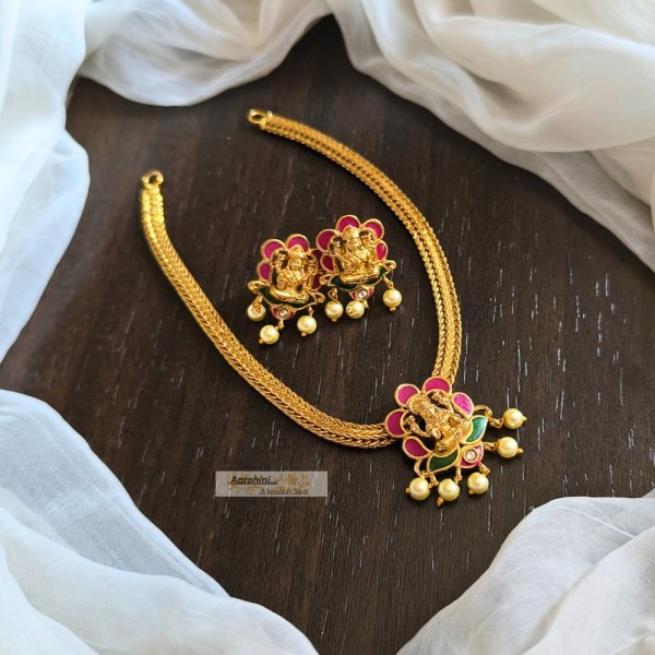 Antique polish premium quality brass metal traditional simple ruby and green enamel lakshmi pendant antique gold look-alike chocker and matching lakshmi earrings stud.