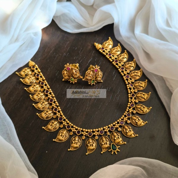 Antique polish premium quality brass metal traditional mango design antique gold look-alike short necklace and matching earrings stud.