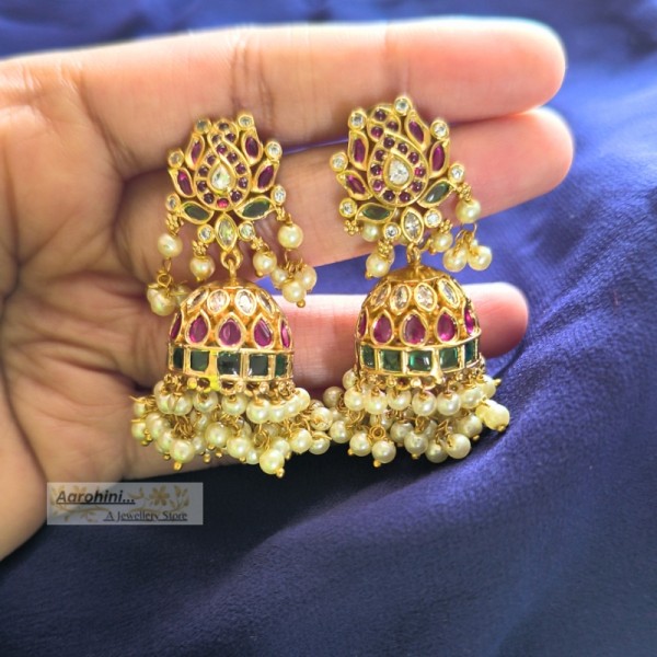 Premium quality brass made Antique matt gold polish white AD stone, Ruby, and green stone Jhumkas, with a lotus stud attached to the Jhumkas. push back type back closer. Pearls hanging attached at the end. Length 5cm.