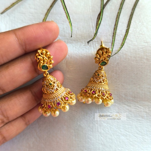 Premium quality brass made Antique matt gold polish kind white, Ruby and green AD stone Jhumkas, with a peacock stud attached to the Jhumkas. push back type back closer. Pearls hanging attached at the end. Length 3.5cm.