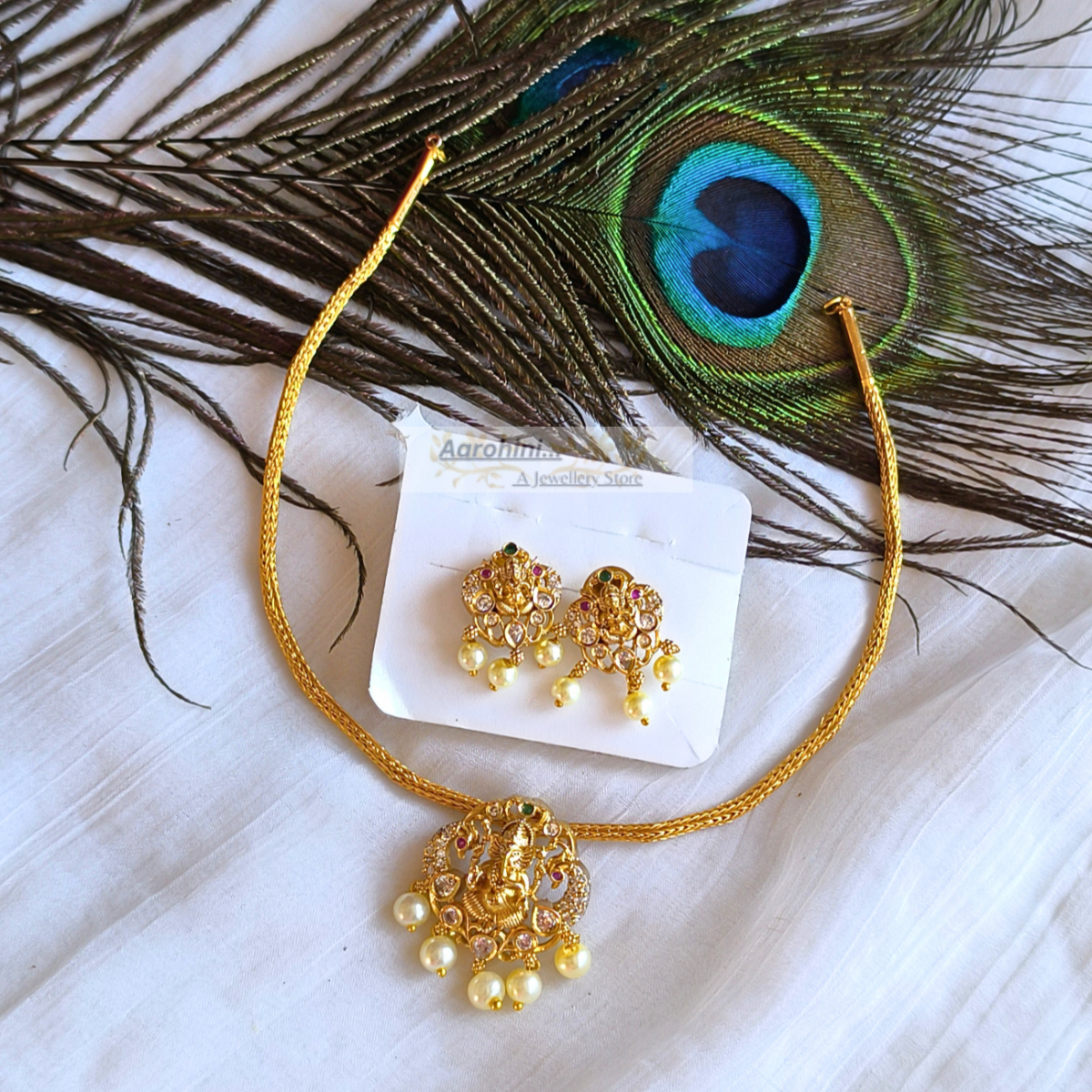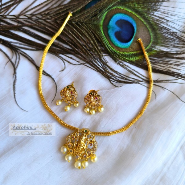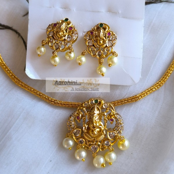 1 gm gold polish premium quality brass metal traditional Ganesha pendant made with an AD stone attigai necklace and matching stud earrings. The pendant is removable and can be used as a locket for any other chain.