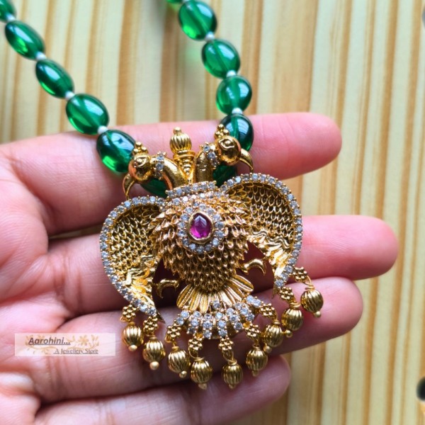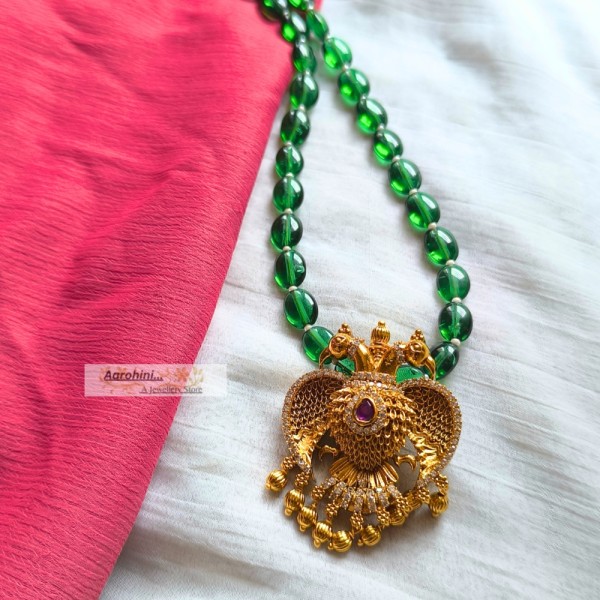 High-quality green beads and antique gold plated AD stone eagle (ghandaberunda) pendant attached in a handmade beaded necklace to look more elegant and beautiful.. pendant is Karnataka's official emblem. The pendant can be removed and can be used on other chains also.