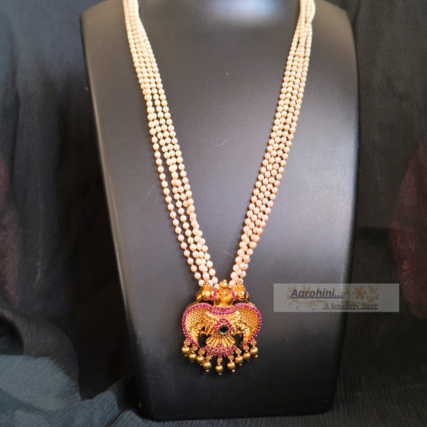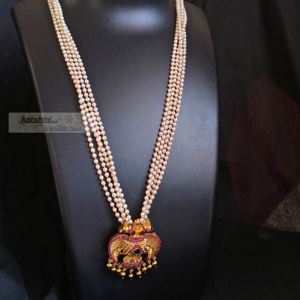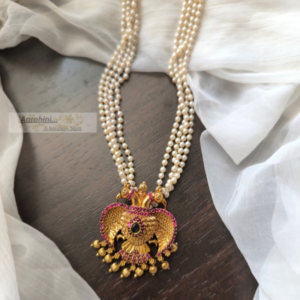High-quality pearls and antique gold-plated ruby and green AD stone eagle (ghandaberunda) pendant attached in a 4-line pearls necklace to look more elegant, traditional and beautiful.. pendant is Karnataka's official emblem. The pendant can be removed and can be used on other chains also.
