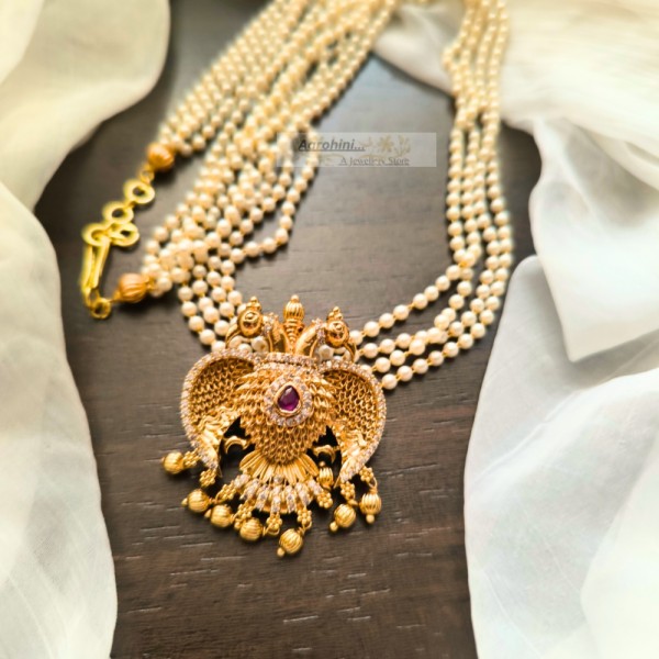High-quality pearls and antique gold-plated white AD stone eagle (ghandaberunda) pendant attached in a 4-line pearls necklace to look more elegant, traditional and beautiful.. pendant is Karnataka's official emblem. The pendant can be removed and can be used on other chains also.
