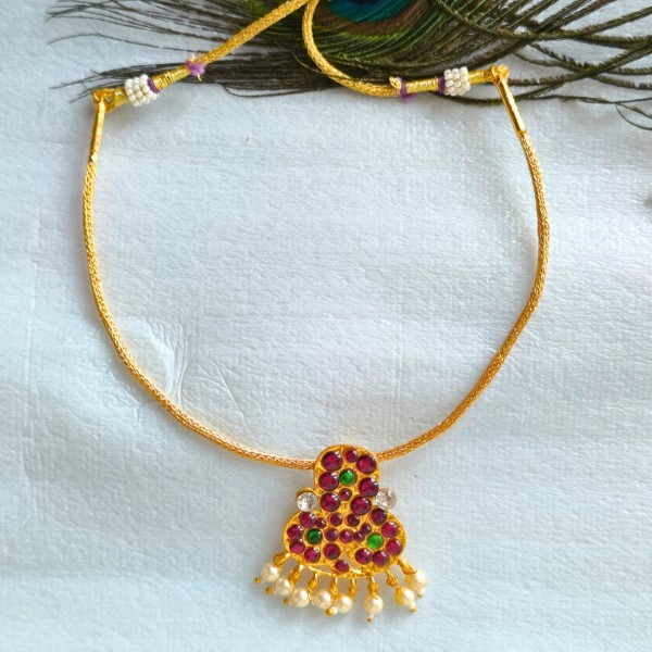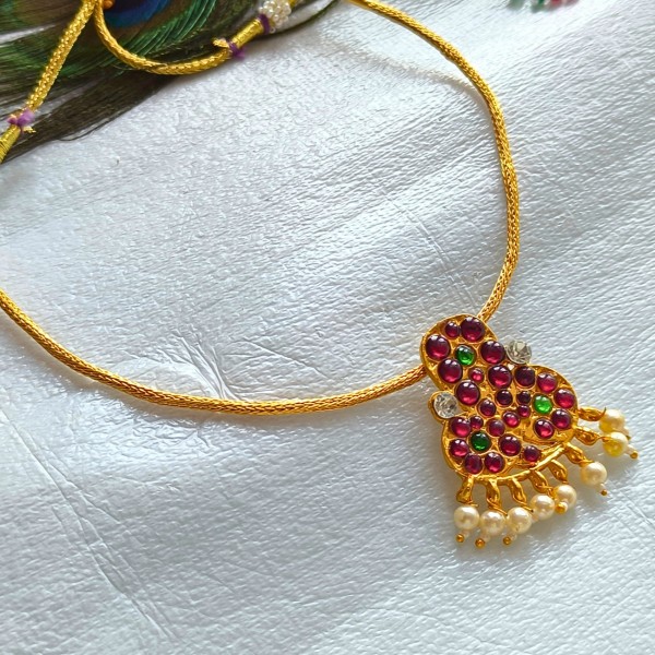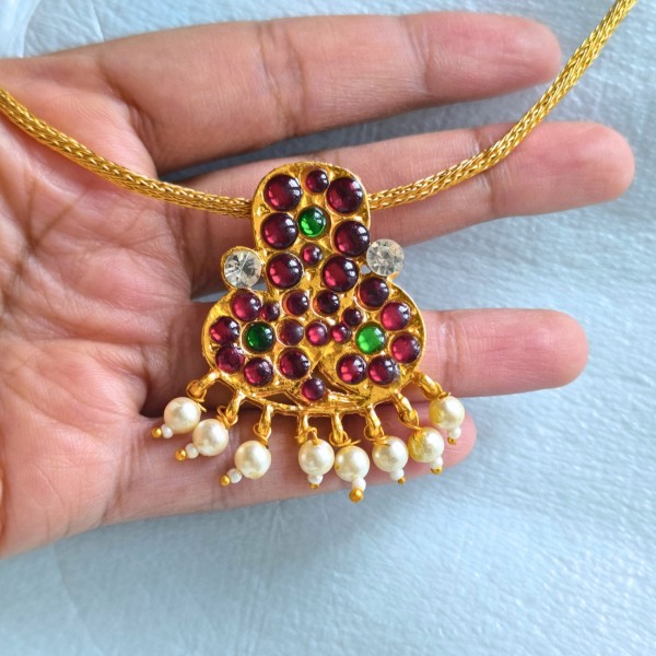 Copper made one gram gold polish kemp stone nagar pendant attigai elegant and traditional handmade necklace gives an lucurious look when you wear.